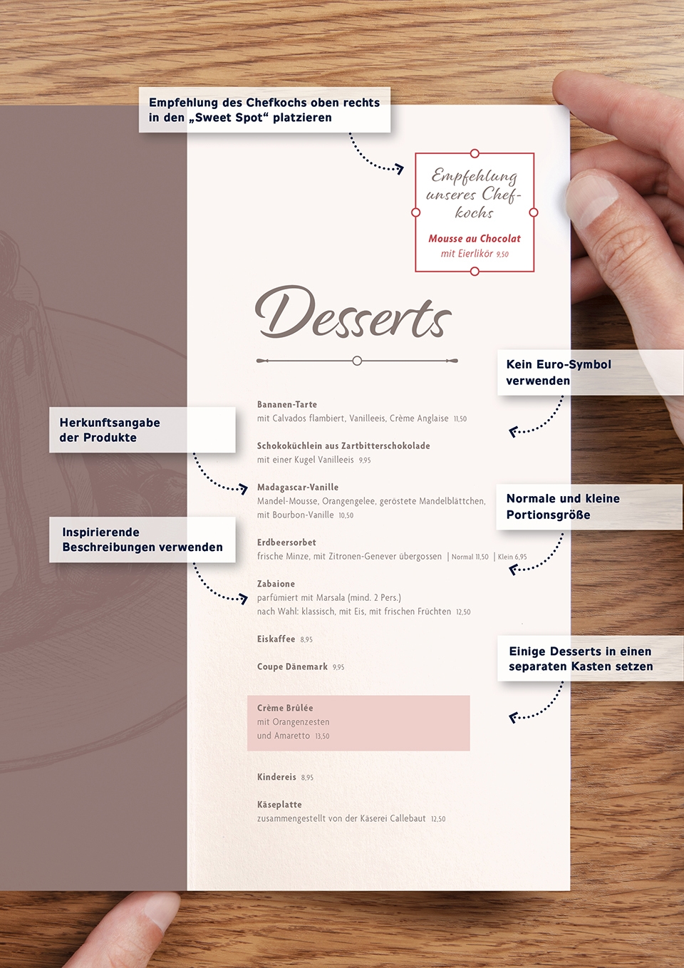 Kunden dazu zu verleiten, ein Dessert zu bestellen, nachdem sie bereits eine Vor- und Hauptspeise gegessen haben, sei eine echte Herausforderung, meint Linda Even. "Du musst definitiv sicherstellen, dass deine Gäste noch Platz für den dritten Gang haben. Du kannst beispielsweise kleine Dessertportionen einführen. Einer meiner Kunden hat angefangen Desserts in zwei Größen anzubieten und eine Dessertabsatzsteigerung von nicht weniger als 92% vermerkt. Benutze Fotos und verführende Wörter, um deine Desserts zu verkaufen, und übertriff dann die Erwartungen."