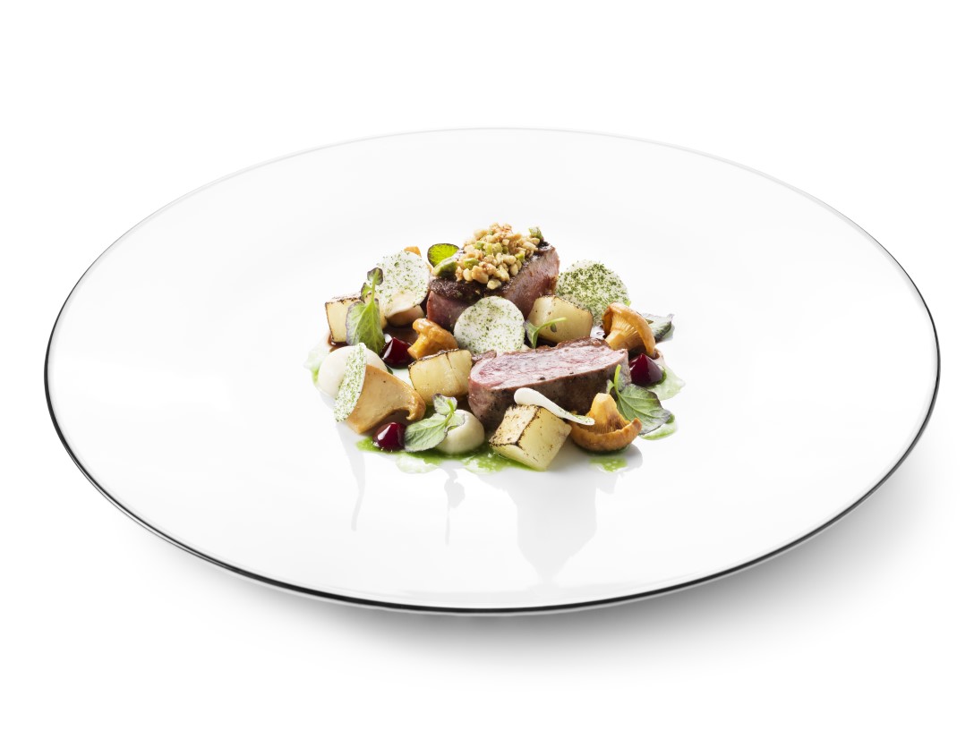 Das Fleisch auf dem Teller anrichten und die Vinaigrette aus Bärlauch und Kreuzkümmel sowie das Gel aus Schattenmorelle und Roter Bete hinzufügen.