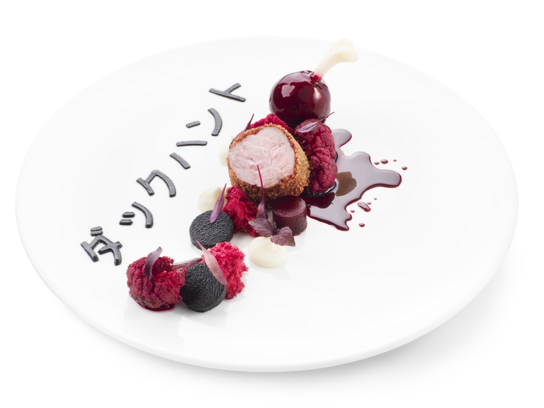 Mit Entenkeule, rotem Blumenkohl, Rote-Bete-Biskuit, schwarzem gekochtem Kohlrabi, Mikro-Shiso-Blättern und Mikro-Rote-Bete-Blättern garnieren.