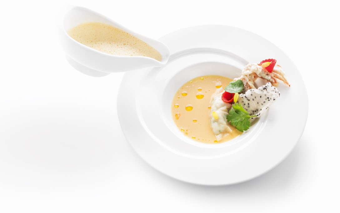 mit Gyoza mit Kaisergranat, Bergamotte, Curryöl, Koriander, Weichschalenkrebs und Sesam-Garnelen-Cracker