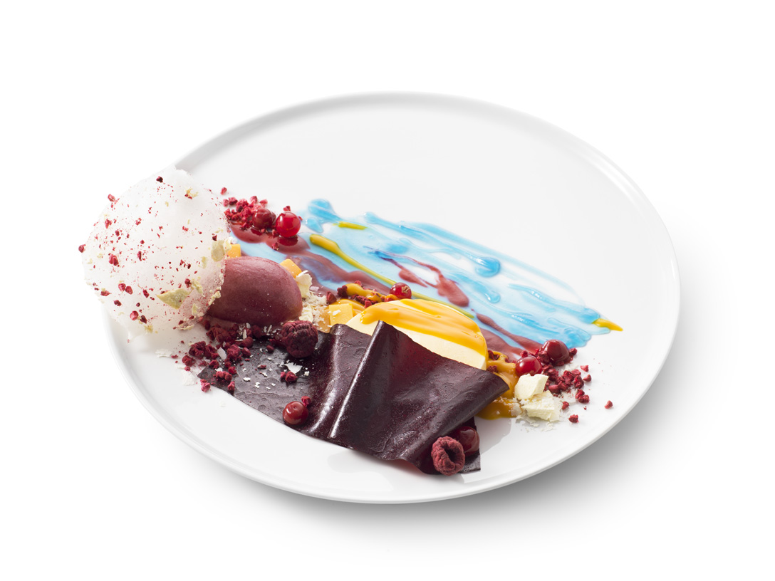 Das Fruchtleder seitlich auf der Panna Cotta anrichten und das Dessert mit dem blauen Gel, den Saucen, dem Johannisbeersorbet und den roten Beeren garnieren.