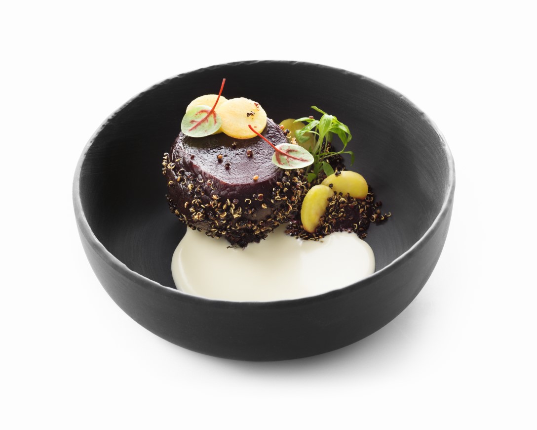 Mit der Blauschimmelkäsesauce, der eingelegten Gelben Bete, der Mikro-Petersilie sowie den Mikro-Rote-Bete-Blättern vollenden.