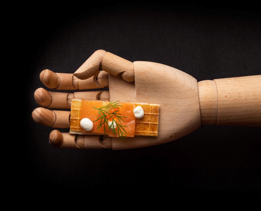 Fingerfood-Idee für eine Waffel mit geräuchertem Lachs, griechischem Joghurt und Dill