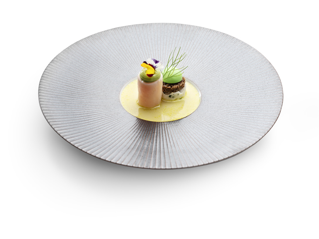Die Brandade mithilfe eines kleinen Ausstechrings anrichten, ein Stück Pumpernickel daraufsetzen und mit einer Apfel-Meerrettich-Kugel komplettieren.