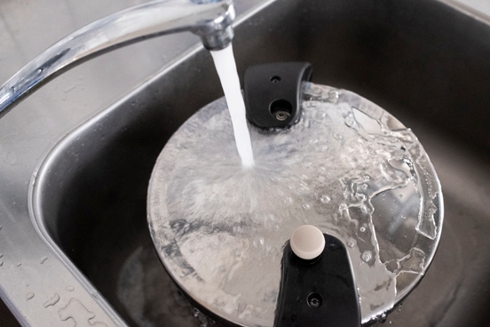 Plaats de pan onder koud stromend water. Zodra er geen druk meer op de pan staat kan je het deksel verwijderen. Dit controleer je door eerst het ventiel te open te zetten en er zeker van te zijn dat er geen stoom meer uitkomt, daarna het deksel eraf te draaien.