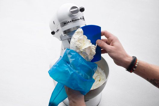 - Roer na het kloppen de room goed door, om de niet opgeklopte room van de bodem van de schaal door de geklopte room te mengen