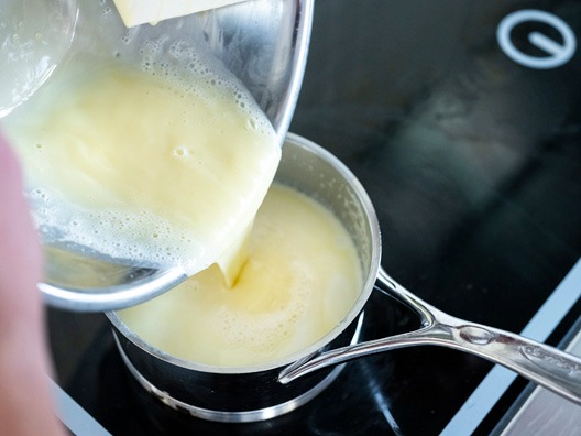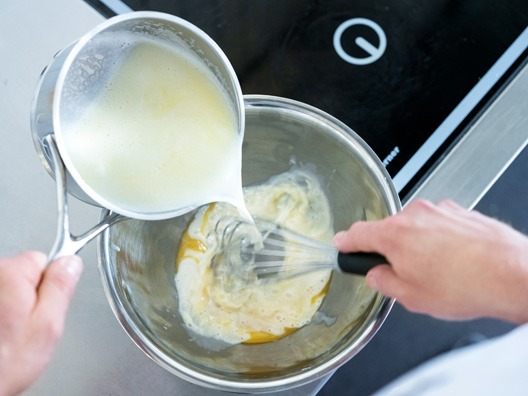 Vaječno-cukrovou směs přidejte k zahřáté směsi.