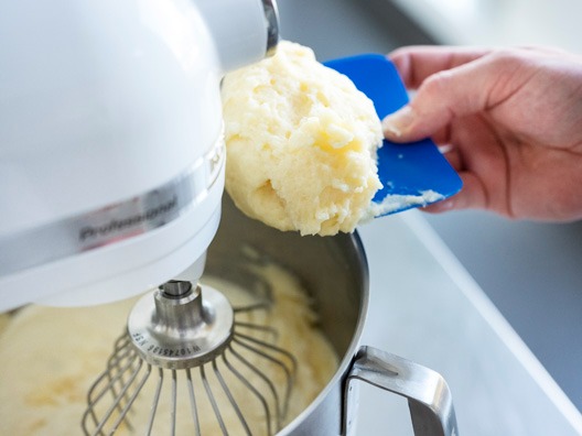 Jemně šlehejte máslo Debic Crème butter Část smetanovo-žloutkové směsi vmíchejte do vyšlehaného másla. Nechte stroj 10 minut pracovat na druhý stupeň.