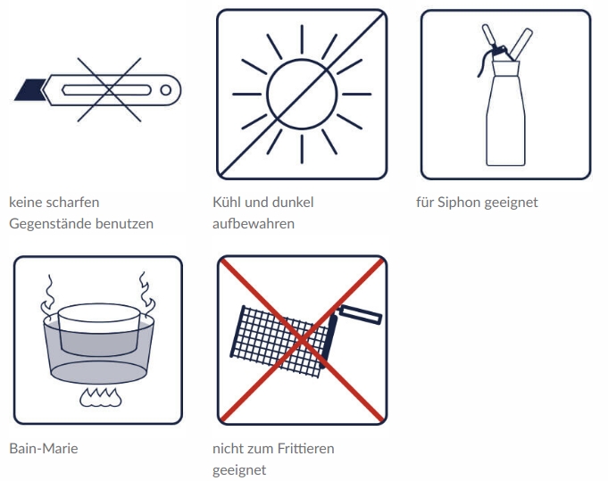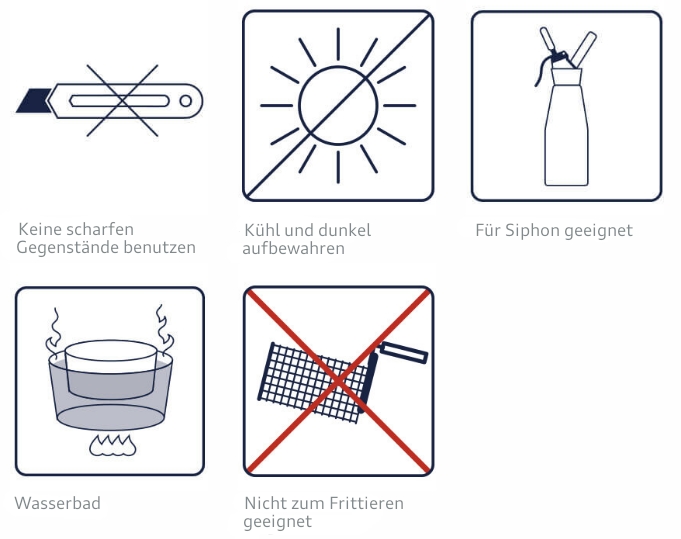 Um beste Ergebnisse zu erzielen, sollte die Sprühsahne 24 Stunden vor Gebrauch im Kühlschrank gut gekühlt werden. Die empfohlene Temperatur liegt zwischen +2 und +7 Grad Celsius. Nicht einfrieren. Während der Servicezeit kann die Sprühsahne direkt aus dem Kühlschrank genommen und verwendet werden. Nach Gebrauch die Sprühsahne reinigen und zurück in den Kühlschrank legen.