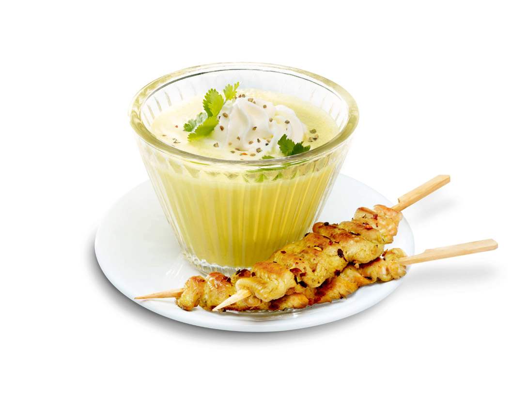 Suppe in hitzestabile Gläser oder Tassen füllen, mit einem Topping aus Debic Profi-Sprühsahne und Korianderblättchen garnieren und mit Hähnchenspießen servieren.