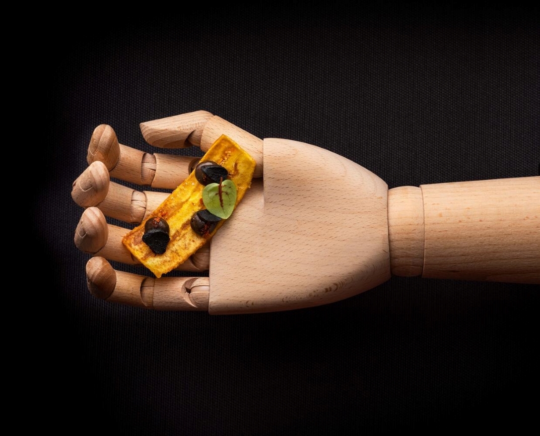 Fingerfood-Idee für Kochbananen-Chips mit einer Crème aus schwarzem Knoblauch