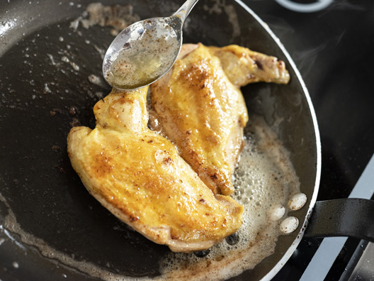 Das Geflügel aus dem Beutel nehmen und gut abtrocknen. Die Flüssigkeit kann für die Sauce weiter verwendet werden.