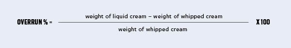 Whatever appliance or mixer you use, when you beat air into whipped cream, it increases in volume. The size of this increase varies depending on the type of cream and the method used for whipping it. To calculate the overrun volume correctly, use the following formula while using the same size container leveled off.