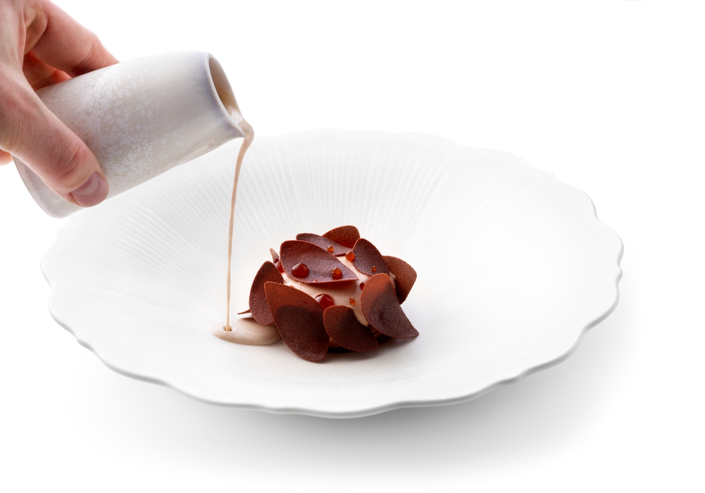 Gaëtan Fiard likes to use products from the region where he works: Bordeaux. ‘Within a hundred kilometre radius I can find dried fruit, hazelnuts, almonds, pistachios, pecans and peanuts. Even now I am still discovering new products and new suppliers." He uses these discoveries to create simple and effective dishes. This dessert with peanuts, chocolate and Espelette pepper is a good example. "Personally I don’t really like spicy dishes. But when it’s combined with chocolate, peanuts and cacao nibs, this pepper truly comes into its own. It gives the dessert a fresh, spicy twist."
