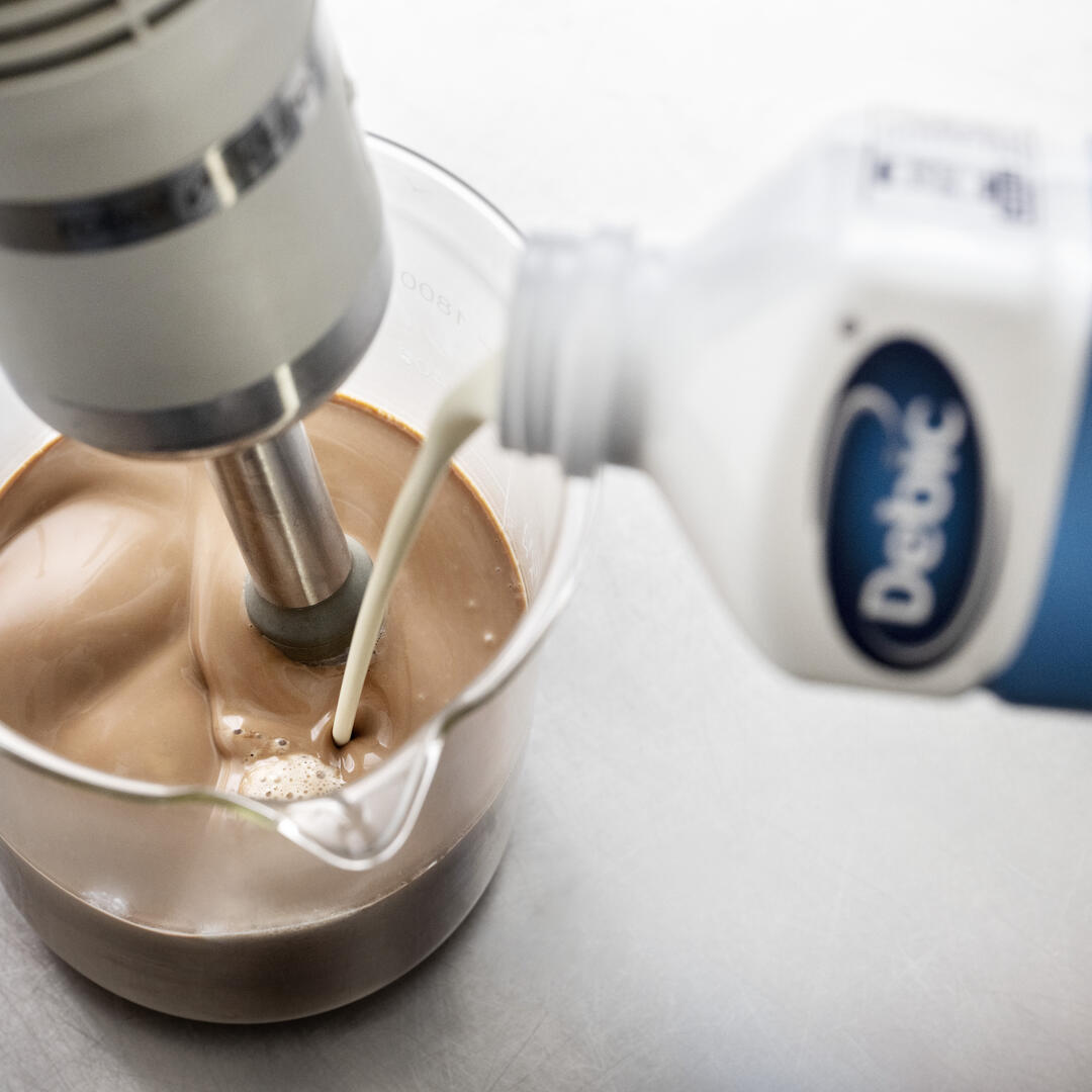 Heat 20% of the cream and pour it over the chocolate. Gently mix using a hand-held blender, keeping it below the surface to prevent air bubbles from forming.