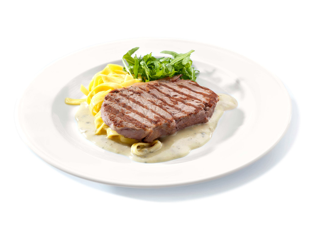Colocar la pasta, la ensalada aderezada y el entrecot en un plato. Napar con la salsa.