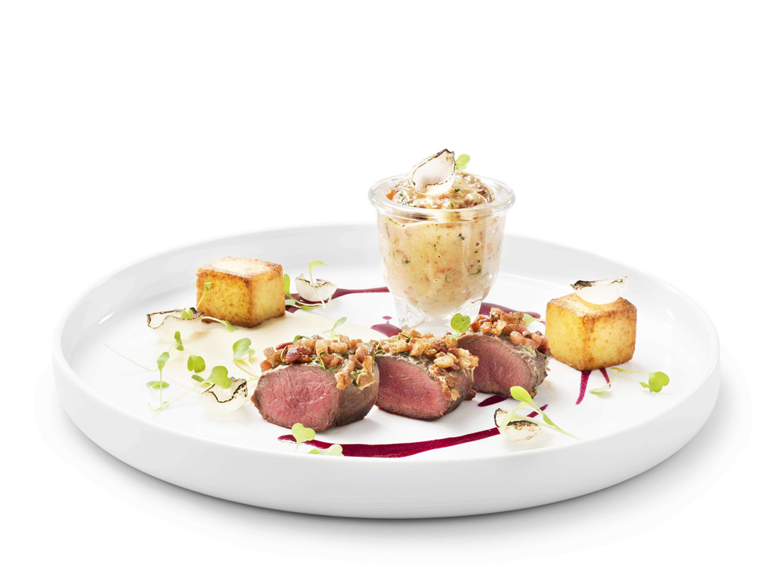 Dorar los muslos de liebre con el Saltear & Asar Debic. Cortar las verduras y la panceta ahumada en brunoise fina. Incorporar a la cocción la panceta, las zanahorias y el apio nabo. Añadir al final los rebozuelos y la chalota. Flambear con el syrah e incorporar el fondo de venado. Dejar cocer durante una hora y a continuación retirar los muslos de la salsa. Cortar la carne en brunoise fina y reducir la salsa a la mitad. Añadir la carne y la Culinaria Original Debic a la salsa. Dejar cocer 20 minutos más a fuego suave y reservar en el frigorífico.