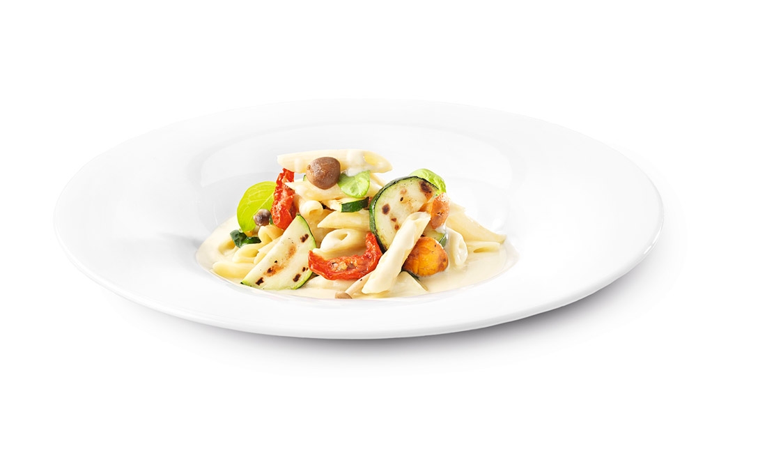 Picar el ajo y las chalotas. Rehogarlas con Saltear & Asar Debic e incorporarles el vinagre de vino blanco. Añadir la Culinaria Original Debic y dejar cocer la salsa a baja temperatura durante una media hora. Pasar la salsa por un colador. Saltear las setas silvestres con el Saltear & Asar Debic y añadir las espinacas y los tomates secos. Cortar los calabacines en rodajas iguales y asarlas por los dos lados en una parrilla.
