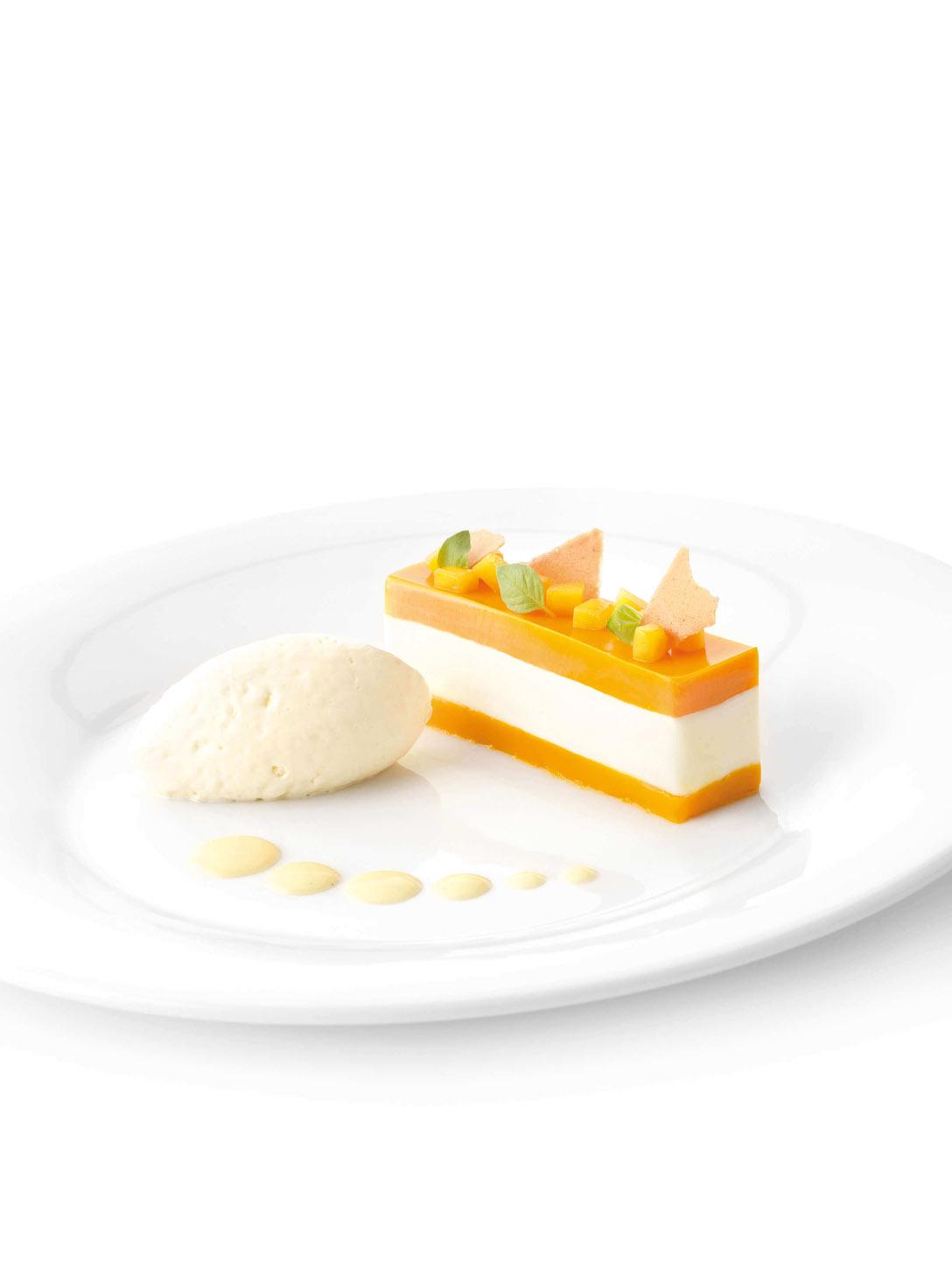 Calentar el puré de mango a 40°C y disolver en él la gelatina previamente remojada. Dejar enfriar a temperatura ambiente.