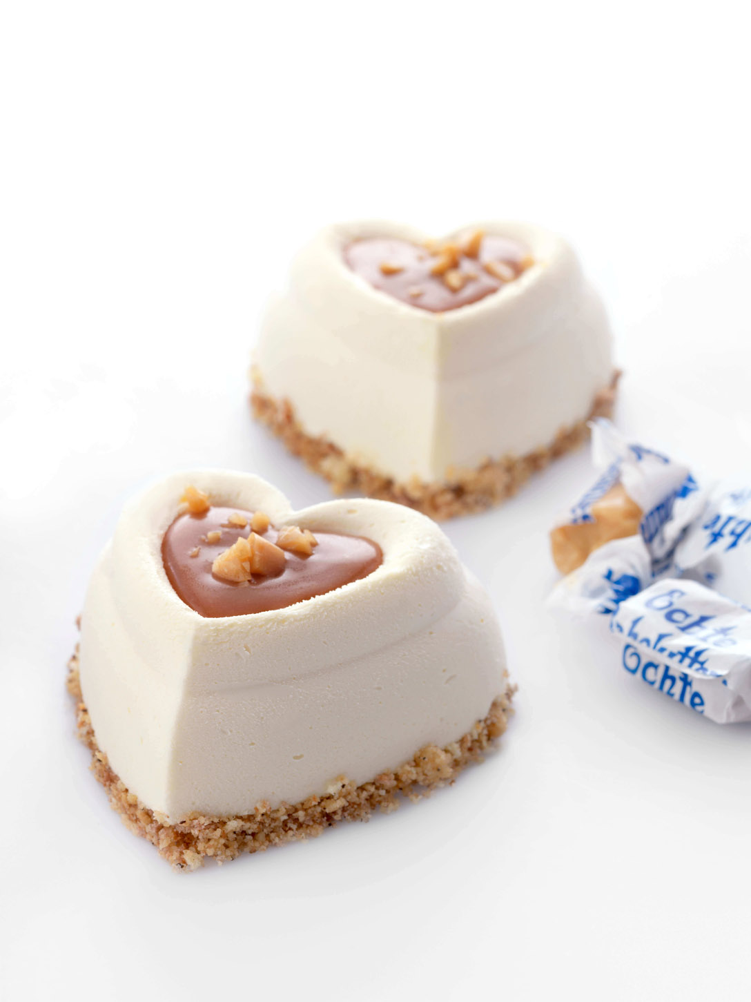Llenar los corazones de silicona con parfait al toffee. Alisar y cubrir de crumble de avellanas.