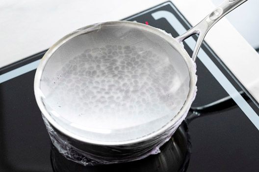 Retirar del fuego y colocar una lámina de plástico sobre el sartén tibia