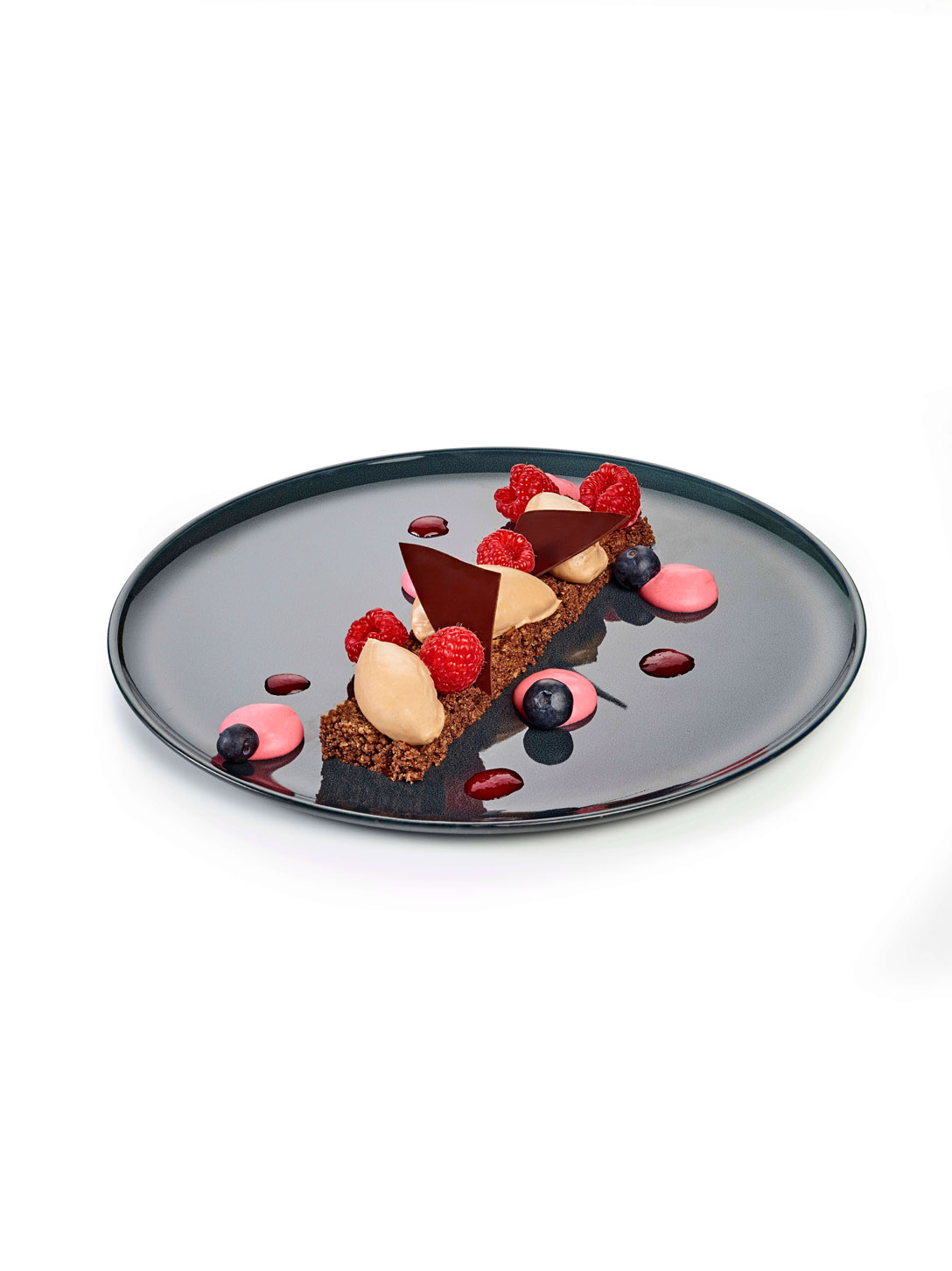 Pocher des pointes de ganache framboise et agrémenter d'éclats de feuilles de chocolat et de fruits rouges.