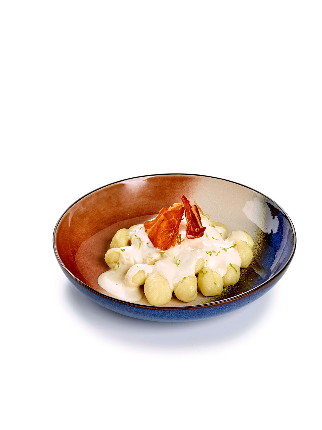 Dans une assiette creuse, disposer les gnocchi et déposer la sauce parmesan avec un siphon.