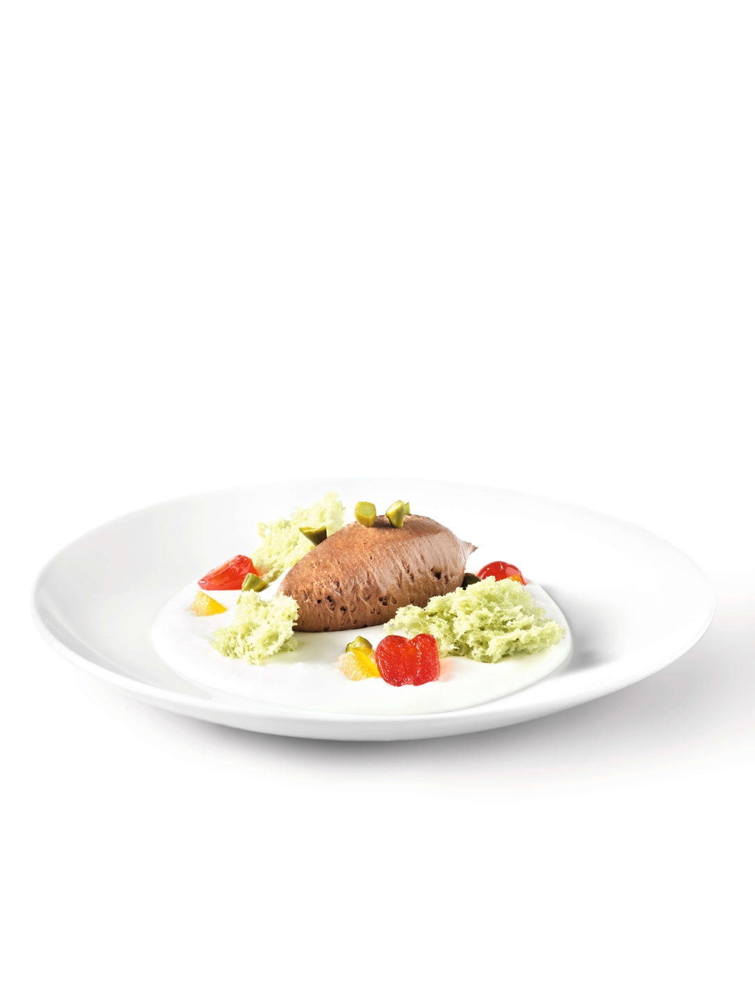Mousse au chocolat, gâteau de Savoie à la pistache, liqueur de cerises, zestes d'orange.