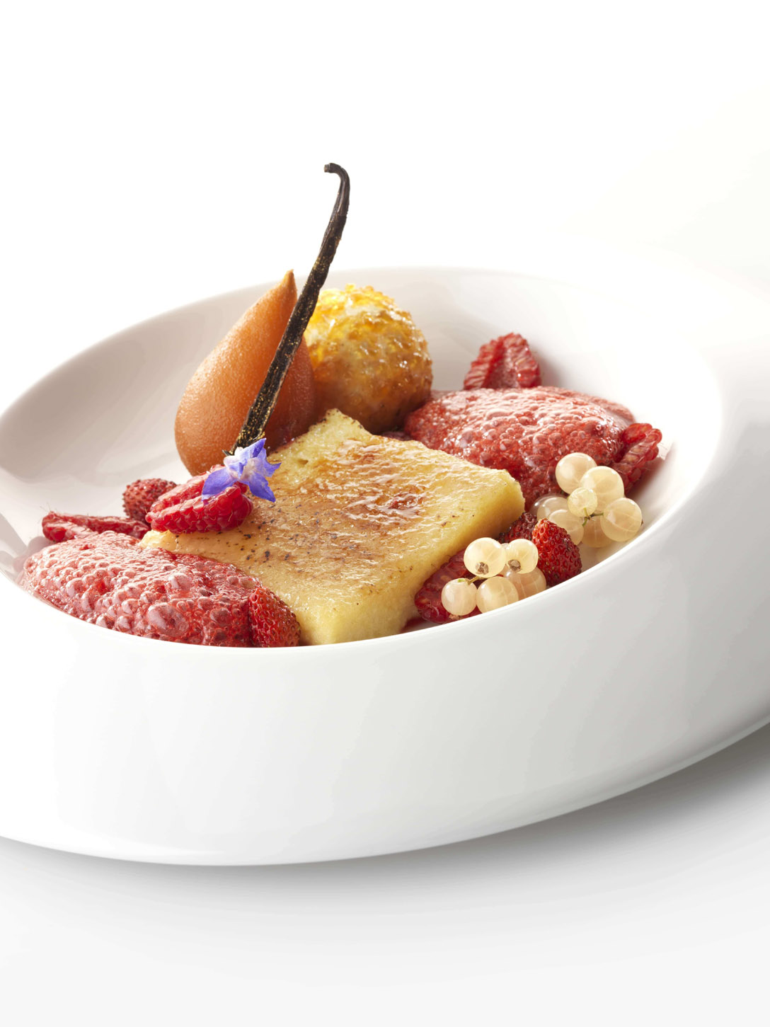 Placez à côté la poire au moka et décorez avec des fruits rouges et le coulis de framboises pétillant.