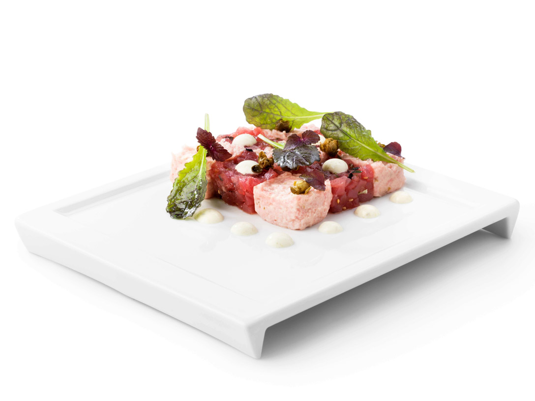 Répartissez les deux tartares sur un emporte-pièce à 9 caissons et décorez le plat avec les feuilles de moutarde, les câpres frits et la vinaigrette.