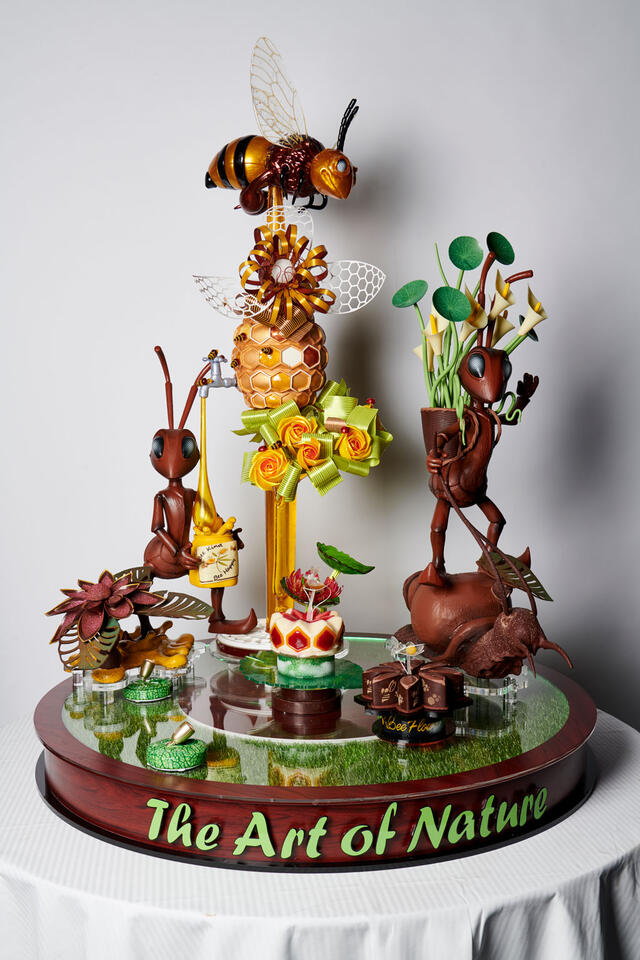 Il Team ha presentato un progetto, titolato “The Art of Nature”, tutto incentrato sul mondo delle api e sulla loro importanza nell’ecosistema. Un progetto che non è stato solo estetica e tecnica ai massimi livelli, ma gusto e capacità di sollecitare i sensi all’assaggio. Un dolce, alto ben 165 centimetri, considerabile come una vera e propria scultura di fiori e insetti di cioccolato, tra cui due grandi formiche e un’ape gigante che offre loro del miele.