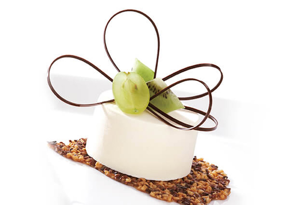 Smodellare il contenuto sulla cialda croccante precedentemente posizionata su un piatto liscio da dessert.