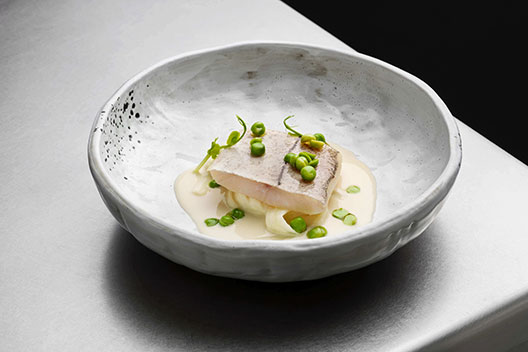 Met beurre blanc van oester, witte asperges en groene doperwten.