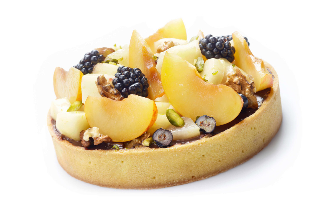 Breng een decor aan van herfst- en winterfruit (abrikozen, pruimen, bosbessen, appelen).