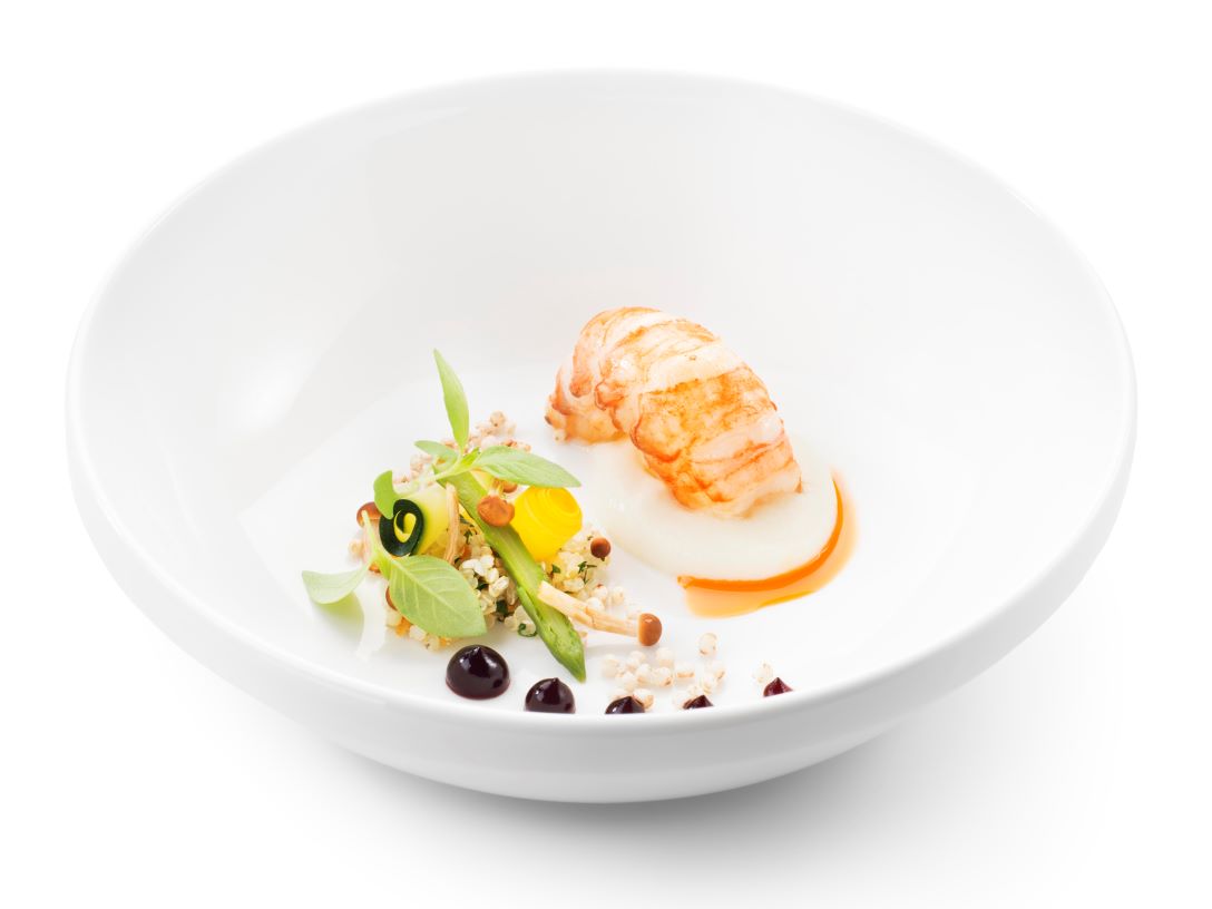 Dresseerde quinoa, de groenten en enkele druppels van de merlotazijngel naast de langoustines.