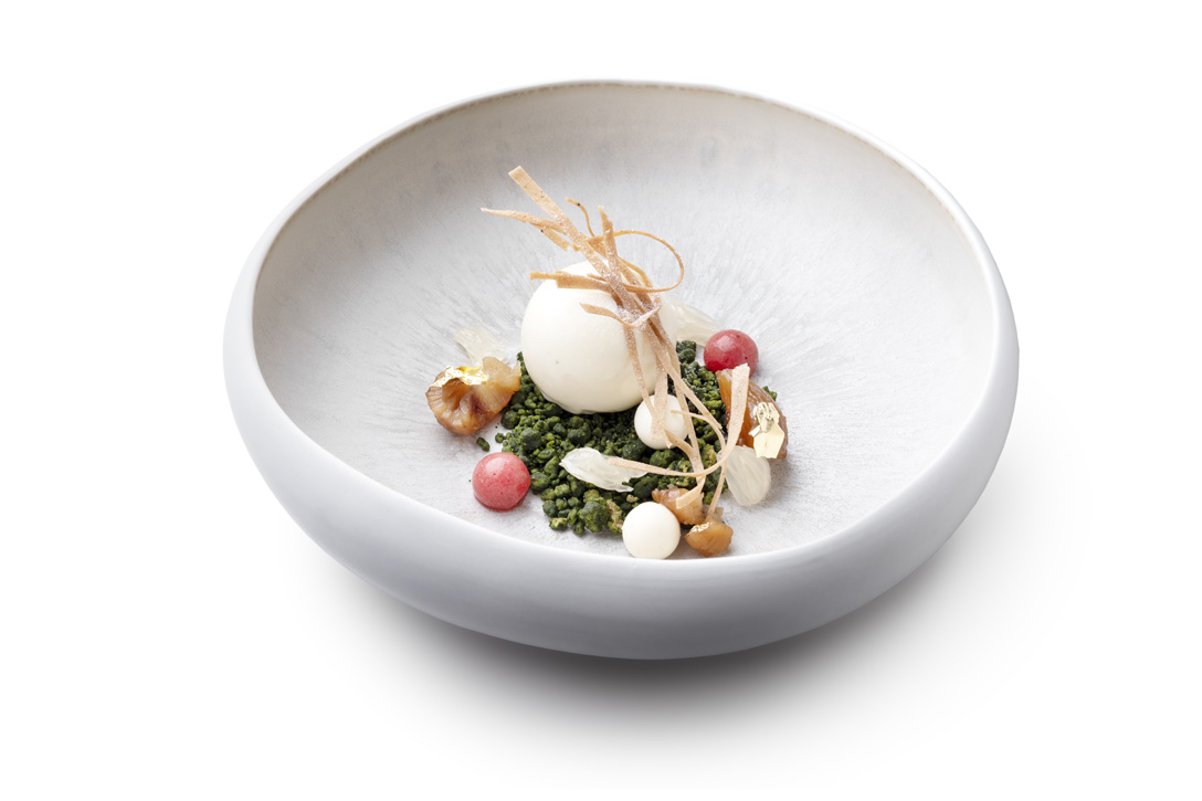 Een zoet koekje gegarneerd met kastanjeroom en aardbeiparels geparfumeerd met vanille en citroen op een bed van matchacrumble.