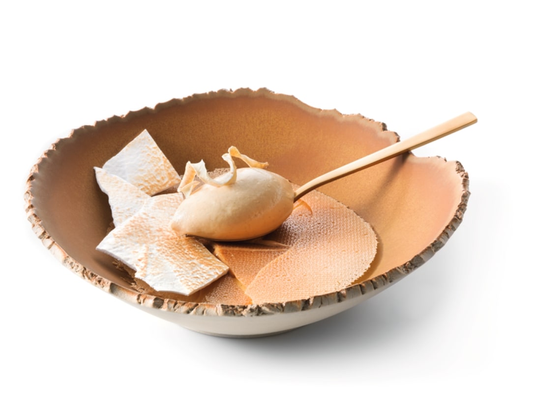 Crème brûlée van pinda en pastinaak met pinda-ijs, meringue en karamel