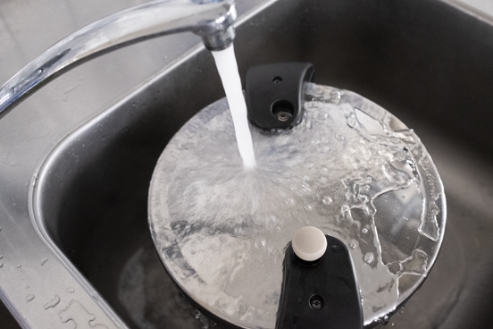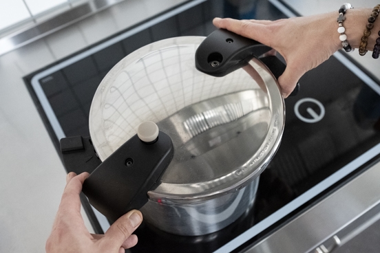 Plaats de pan onder koud stromend water. Zodra er geen druk meer op de pan staat, kunt u het deksel verwijderen. Dit controleert u door eerst het ventiel te open te zetten en er zeker van te zijn dat er geen stoom meer uitkomt, daarna het deksel eraf te draaien.