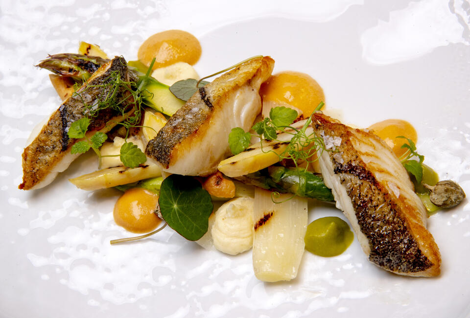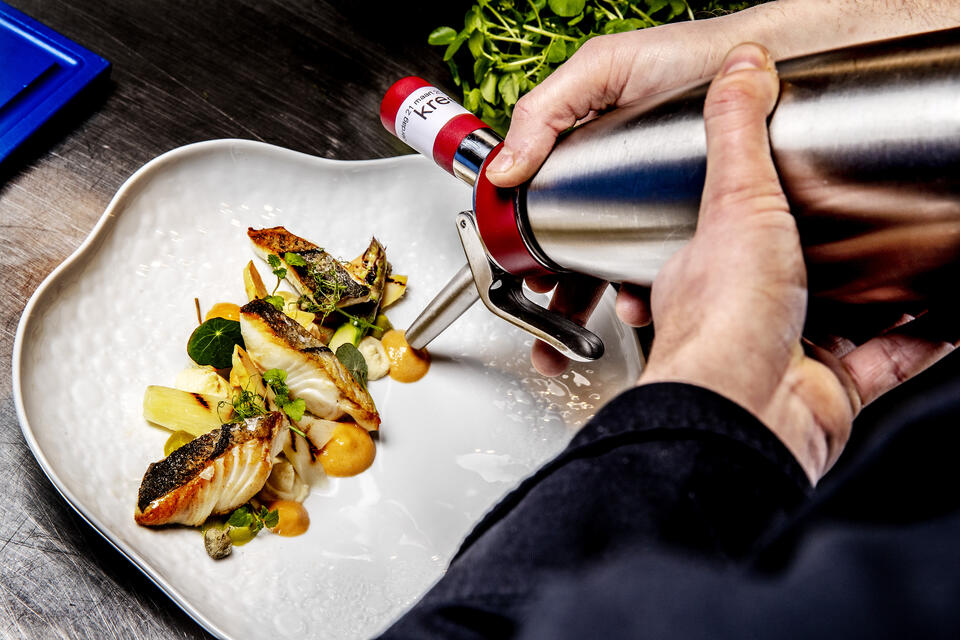 Slezak werkte mee aan het ontwikkelproces van de vernieuwde kookroom. Hij testte hem in de praktijk en heeft de oude en de nieuwe naast elkaar kunnen proeven. Nu maakt hij er, naast romige soepen, met name sauzen mee. Zoals de schuimsaus van kreeftenbisque, die hij serveert bij zijn gegrilde witte en groene asperges met schelvis, cashewnoten en doperwtencrème (zie foto). Voor de schuimsaus laat hij kreeftenbisque tot de helft inkoken, dan gaat er kookroom bij, die hij nogmaals tot de helft laat reduceren. Vervolgens gaat de saus de kidde in. Slezak: “Deze bereidingswijze levert meer rendement op, maar is ook praktisch want de saus staat al klaar in de sifon en de kwaliteit blijft top.”