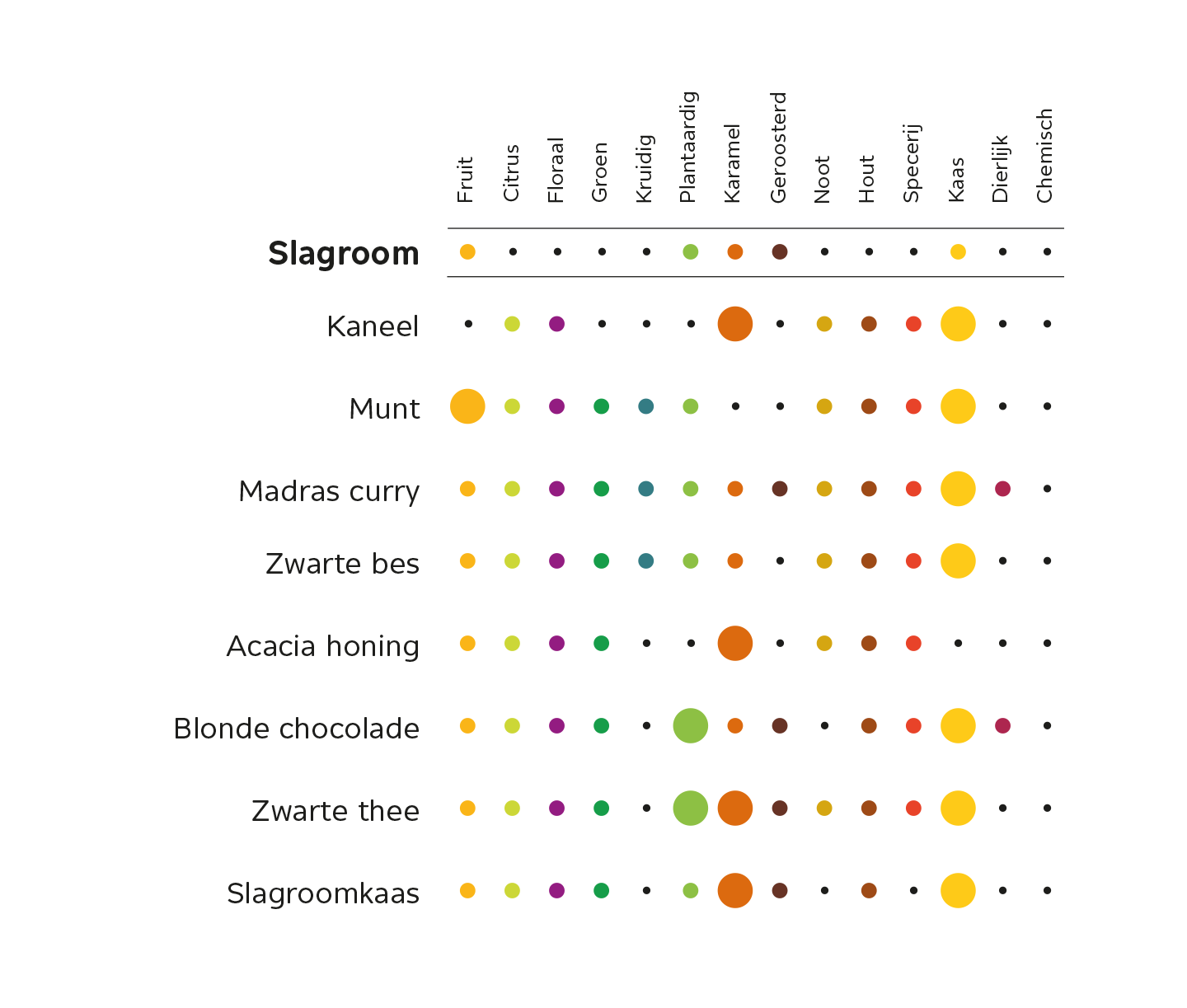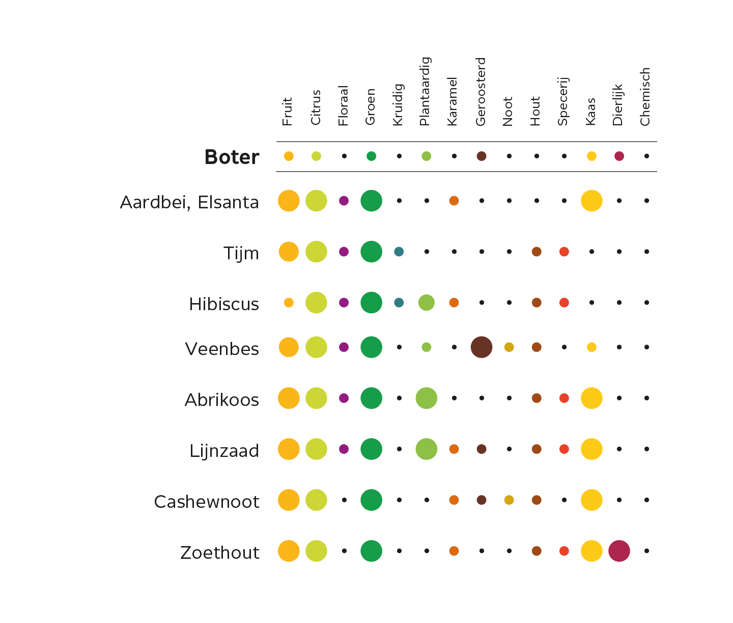 We hebben onze belangrijkste ingrediënten, boter en slagroom, onderworpen aan dit uitgebreide Foodpairing® algoritme. Basisingrediënten voor iedere patissier, die openstaat voor het verkennen van vernieuwing aan de culinaire horizon.