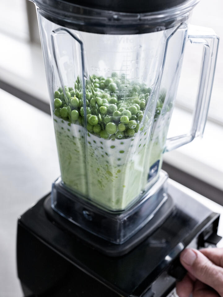 Om de gegaarde groentes tot een puree te verwerken, cutteren we deze fijn in de blender.