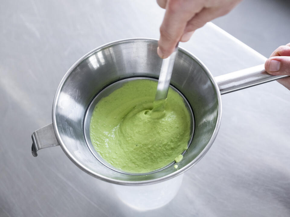 Om er zeker van te zijn dat de puree glad is, passeren we de groentepuree door een fijne zeef. Hierna kunnen we de groente gaan verwerken in Debic desserts.
