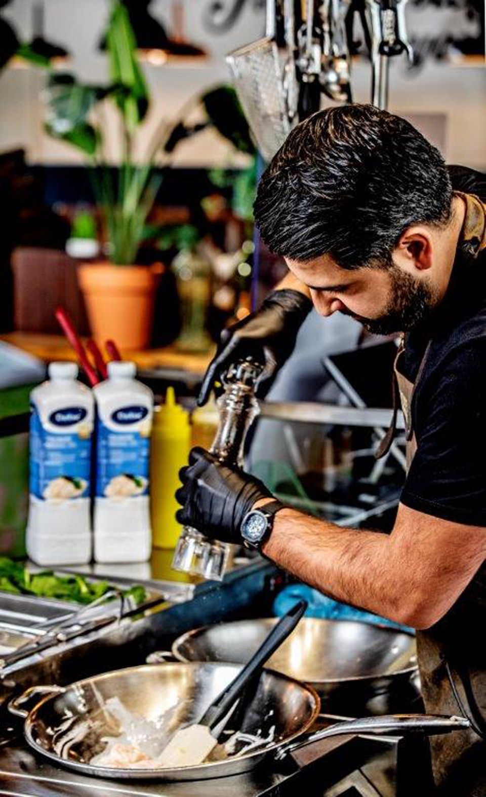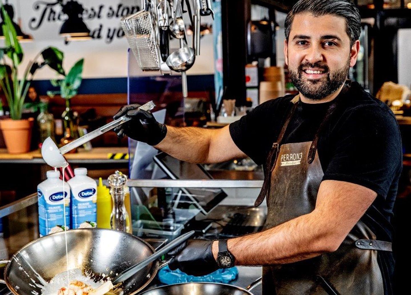Als we Perron3 betreden, zien we meteen eigenaar en chef Eqbal Mangal in de open keuken. Hij bereidt een pasta in roomsaus met garnalen, gesnipperde uitjes, bladspinazie, krulpeterselie, cherrytomaatjes en huisgemaakte pesto. Het is één van de vele bestellingen die vandaag op de planning staat. “Ja, we hebben het ondanks alle strenge coronaregels erg druk. We draaien zelfs beter dan voor deze crisis”, vertelt Mangal enthousiast.