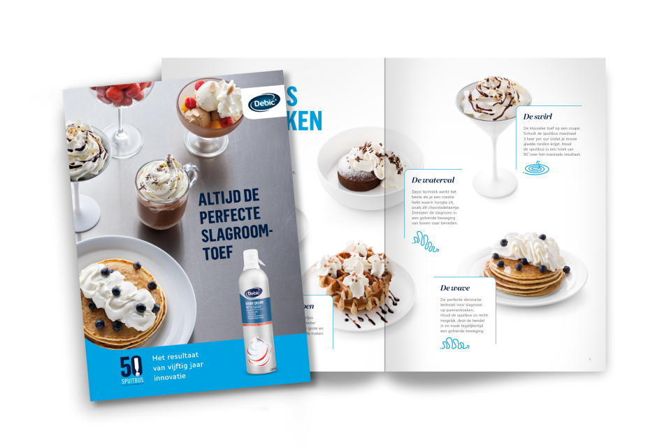 De perfecte decoratietechniek voor slagroom op pannenkoeken. Houd de spuitbus zo recht mogelijk, druk de hendel in en maak tegelijkertijd een golvende beweging.