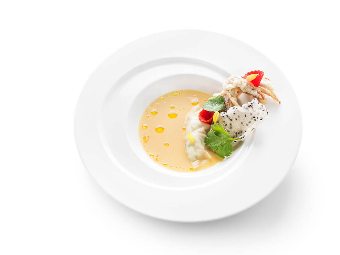Een soep met gyoza met langoustine, bergamot, curryolie, koriander, softshell krab en sesamkroepoek