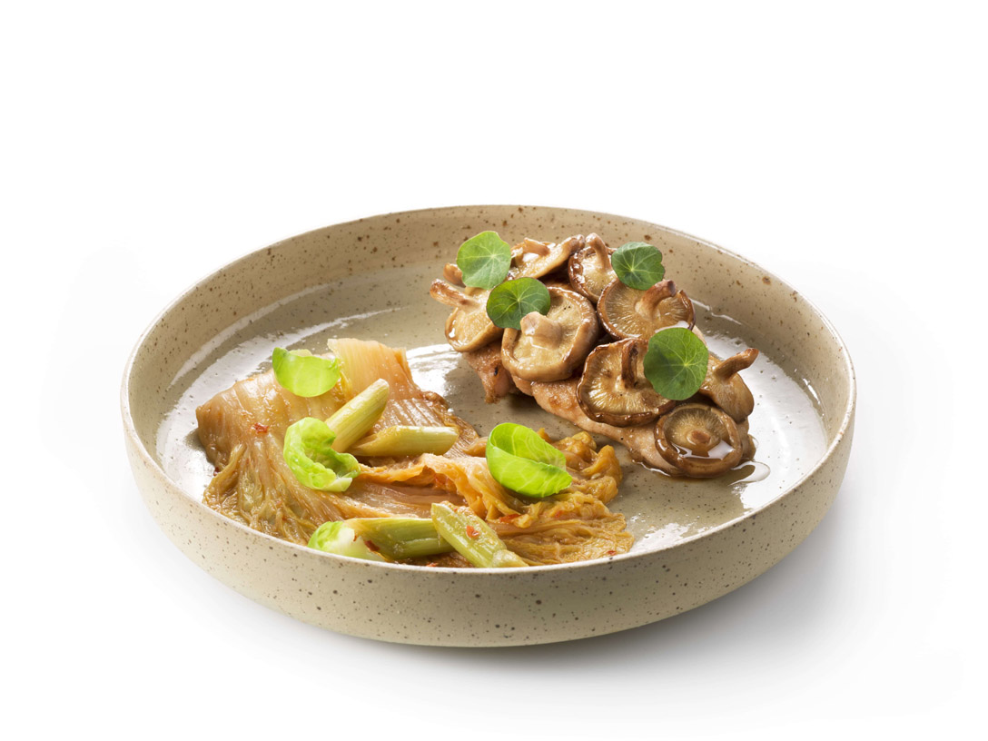 Dresseer de kimchi op het bord en werk verder af met de zorri cress en de spruitblaadjes.