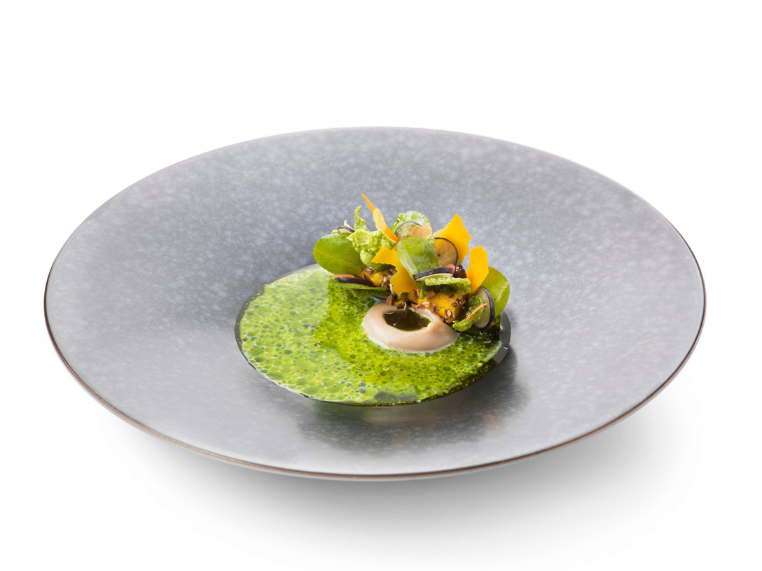 Schep de kruidenoliemelk van onder af, zodat melk en olie samenkomen op het bord.