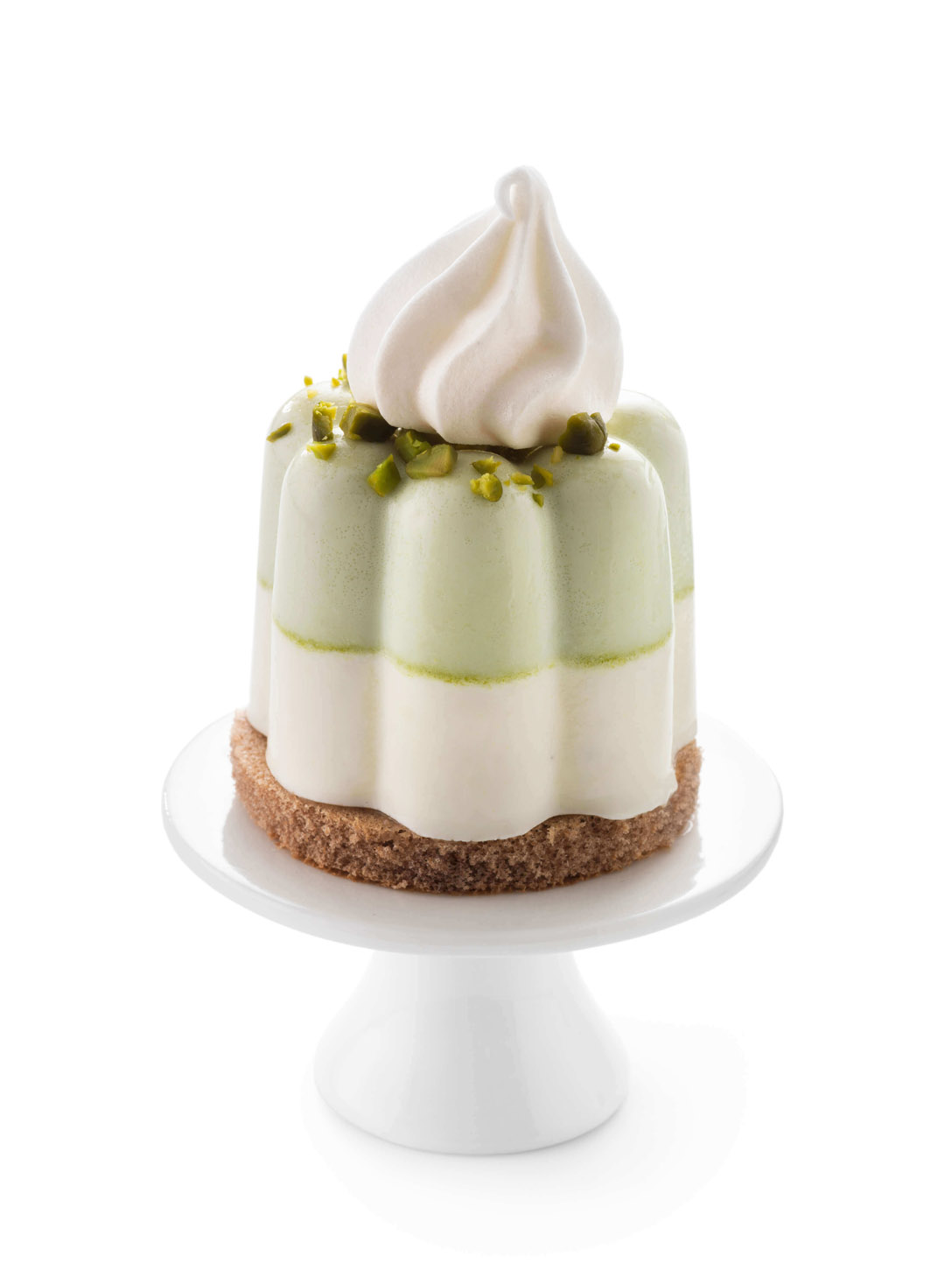 Voeg de pistache pâte toe aan één deel en portioneer in de siliconen matten en laat vervolgens opstijven in de koeling.