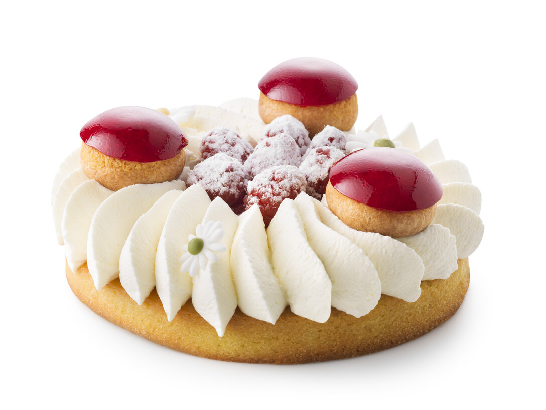 Plaats de soesjes op de taart en decoreer met verse frambozen.