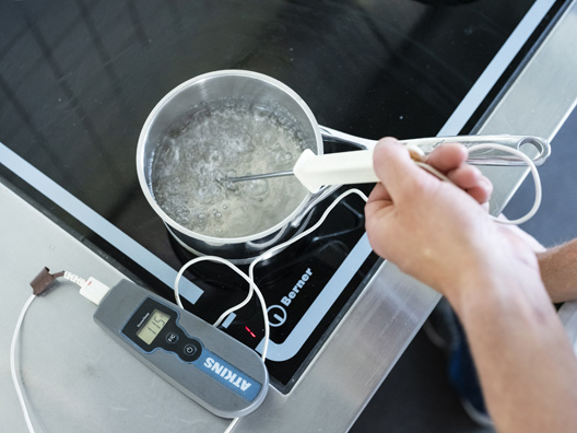 Laat de siroop verder koken tot 120 °C en giet dan straalsgewijs over het opgeklopte eigeel.